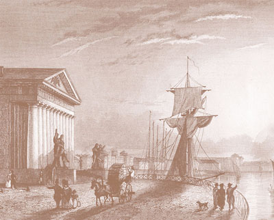 В 1804 г. училище преобразовали в Кадетский корпус. Вскоре по проекту А.Н.Воронихина для него начали возводить комплекс новых зданий и к 1811 г. на набережной появился торжественный архитектурный ансамбль, главный вход в который был украшен двенадцатиколонным классическим портиком и скульптурами «Геракл, удущающий Антея» и «Похищение Прозерпины» работы С.С.Пименова и В.И.Демут-Малиновского.